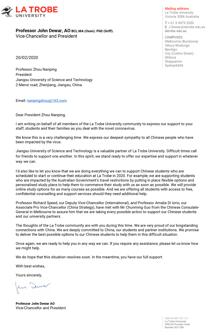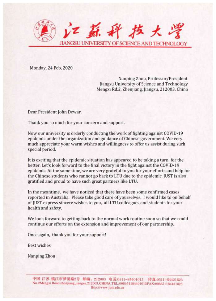 周南平校长于24日向John Dewar校长回信,感谢他和全体乐卓博大学同仁对学校师生的真诚关心与鼓励,以及对无法按期赴澳的中澳项目学生所提供的合理安排与全力协助。周南平校长也向澳方校长通报了当前我国疫情状况明显向好的趋势,希望疫情阻击战的胜利早日到来,两校能够尽快继续就合作的拓展与深化展开交流。