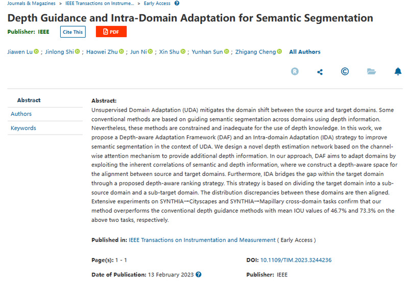 近日,我校计算机学院2020级硕士研究生卢加文为第一作者,史金龙教授为通讯作者,在计算机仪器仪表学TOP期刊IEEE TRANSACTIONS ON INSTRUMENTATION AND MEASUREMENT上发表了题为“Depth Guidance and Intra-Domain Adaptation for Semantic Segmentation”的高水平学术论文。