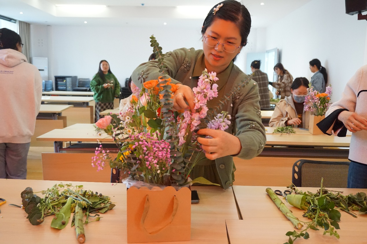活动开始前,现场工作人员将鲜花、花篮、剪刀、模具、一次性手套等工具提前放置在桌上。老师们入座后,主持人致开场词并介绍活动流程。在插花过程中,老师们各具匠心,巧妙构思,美丽的鲜花经过她们的修剪搭配,突出了花朵亭亭玉立、飞舞横斜的雅斜姿态。错落有致的搭配,形成“特殊”的节日礼物。在制作冷制蚕丝手工皂时,老师们更是别出心裁,用四种颜料调配出紫色并在皂中冷制成满天星花朵。