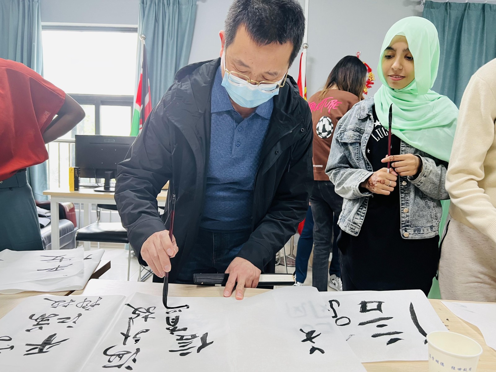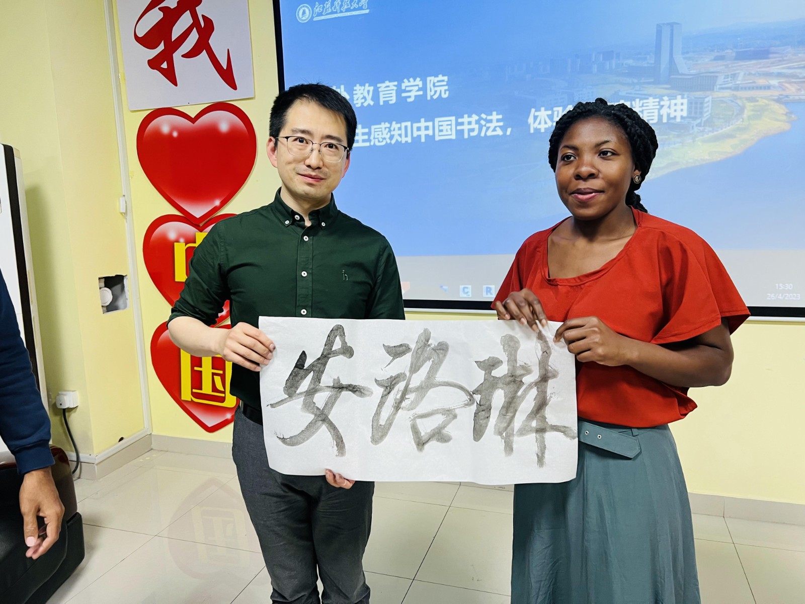 4月26日下午,在我校办学九十周年校庆即将到来之际,同花顺手机登录入口海外教育学院举办了留学生中国书法体验活动,海外教育学院全体院领导与二十多名留学生以方寸砚台为载体,以笔墨文字为媒介,泼墨挥毫,深刻感受传统文化,进一步抒发了爱校爱华的情怀。