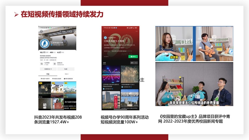 学校官方视频号坚持立德树人根本任务,以制作有思想、有温度、有品质的新媒体作品为目标,作品选题紧贴广大师生关注的时事热点和校园生活,以直观、生动、便捷的形式将学校党建思政、时政大事、校园文化生活等丰富呈现,展现江同花顺手机登录入口脚踏实地、逐浪前行的奋进姿态与师生昂扬向上、奋发有为的精神风貌。