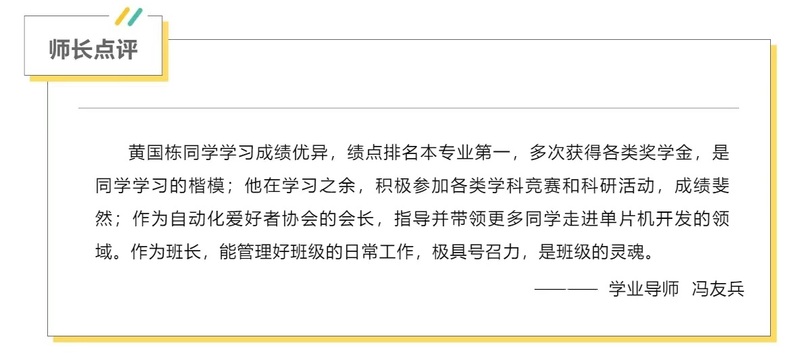 担任班长,绩点专业第一,保研南理工,获得国家奖学金、人民奖学金特等奖、国家励志奖学金、全国大学生电子设计竞赛江苏省二等奖、全国大学生智能汽车竞赛全国二等奖、第十届蓝桥杯全国软件和信息技术专业人才大赛全国一等奖、江苏省机器人大赛三等奖、校三好学生等诸多奖励和荣誉......这就是全面发展的“六边形学霸”黄国栋。