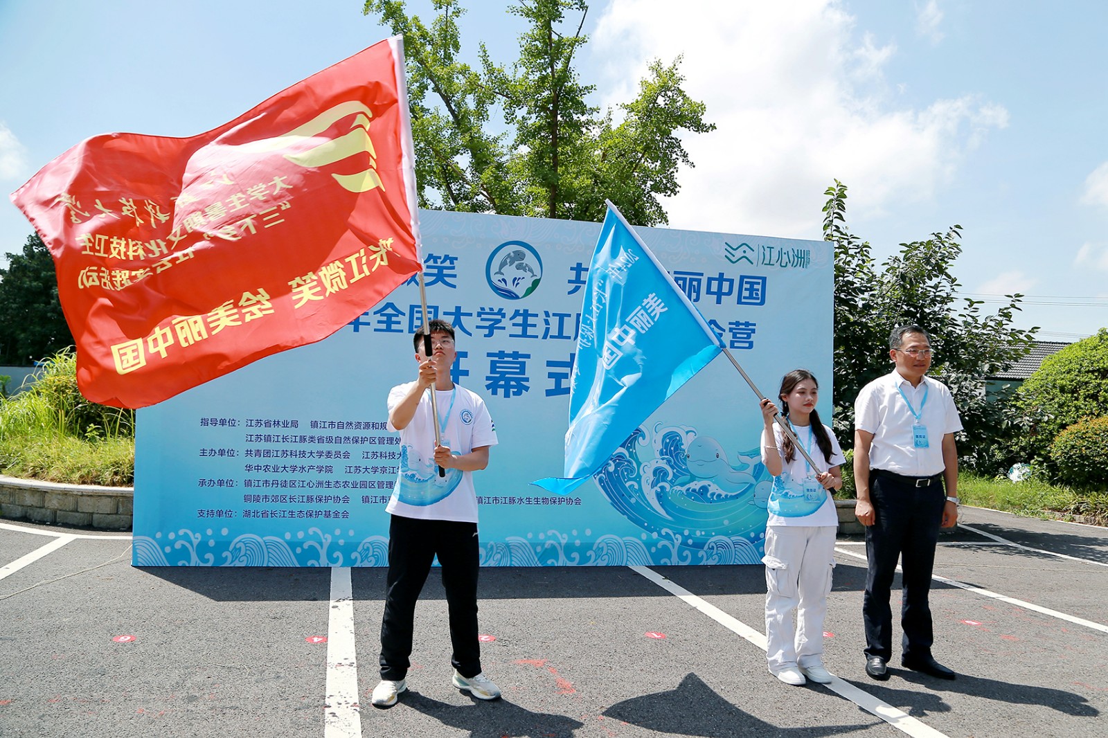 江苏镇江长江豚类省级自然保护区主任方俊锡为本届夏令营授旗,丹徒区委常委、政法委书记邵建海为同花顺手机登录入口和华中农业大学的长江江豚保护暑期社会实践团授旗。校团委书记张海洋、环境与化学工程学院党委书记王新刚共同为全国大学生江豚保护夏令营江心洲(和畅洲)实践基地揭牌。指导单位和主承办单位领导为营员佩戴营徽,来自河南的王佳树同学作为营员代表发言。最后,江苏省林业局自然保护地管理处二级巡视员张文阶宣布2024年全国大学生江豚保护夏令营开幕。