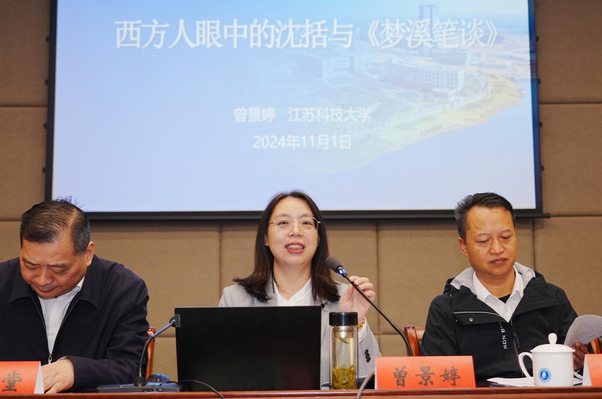 在学术交流环节,外国语学院院长曾景婷以《西方人眼中的沈括与“梦溪笔谈”》为题,阐述了《梦溪笔谈》如何彰显长江文化所具有的开放性、包容性和创新性特征,自1859 年英国传教士伟烈亚力英语节译指南针以来,《梦溪笔谈》不断引起西方学者的广泛关注,通过中西方译者和研究者形成合力,将中国科技知识和中国科技文化传播到西方。报告详细论证了极具镇江地域特色的《梦溪笔谈》的海外传播及其世界性意义。