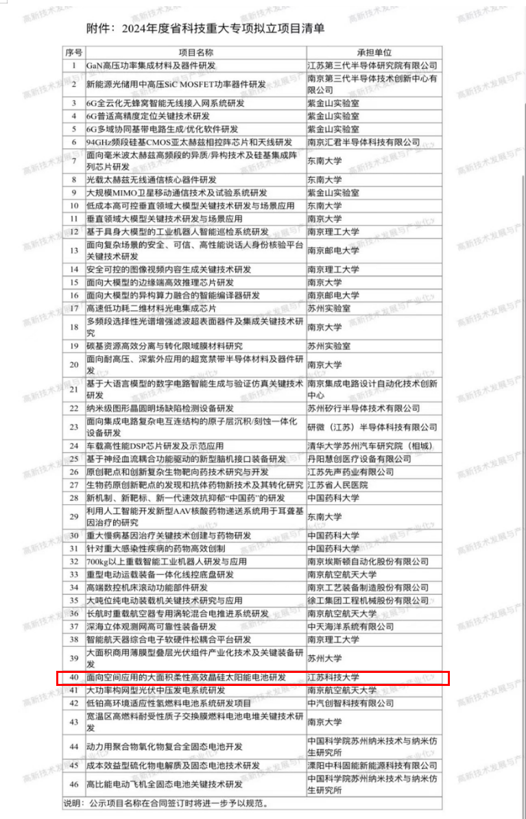 近日,江苏省财政厅、科技厅下发《关于下达2024年省科技重大专项资金的通知》,全省共批准46项。经过激烈竞争,由叶永林副校长、能源与动力学院李阳教授团队联合江苏美科太阳能科技股份有限公司等单位申报的江苏省科技重大专项《面向空间应用的大面积柔性高效晶硅太阳电池研发》脱颖而出,获得了专家的一致认可,立项金额达2000万元。这是我校首次牵头获批执行该类型科技项目,实现历史性突破。
