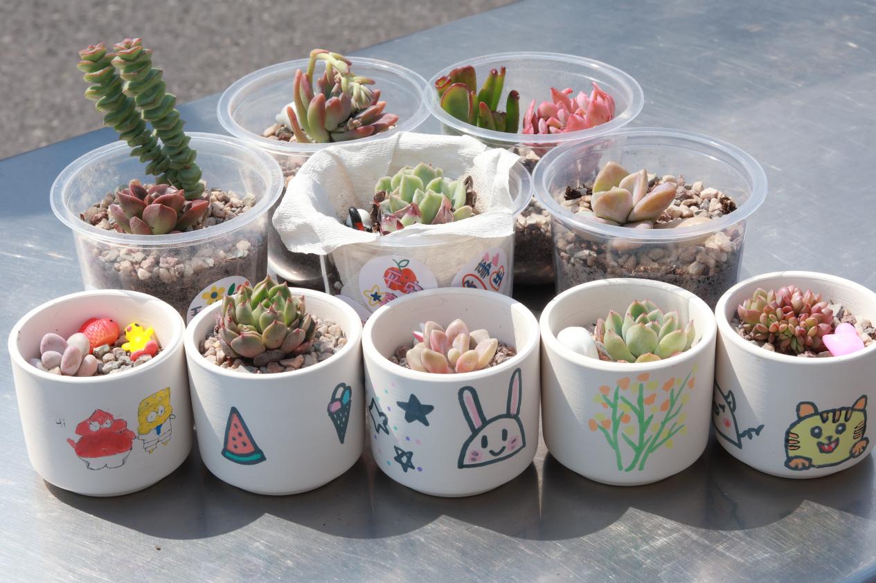 活动现场,摆放着各式各样憨态可掬的多肉植物,肥厚的叶片饱满多汁,仿佛藏着整个春天的生机。旁边整齐排列的素色花盆,以及琳琅满目的DIY材料,如颜料、画笔、彩色贴纸、小装饰等,瞬间点燃了同学们的创作热情。