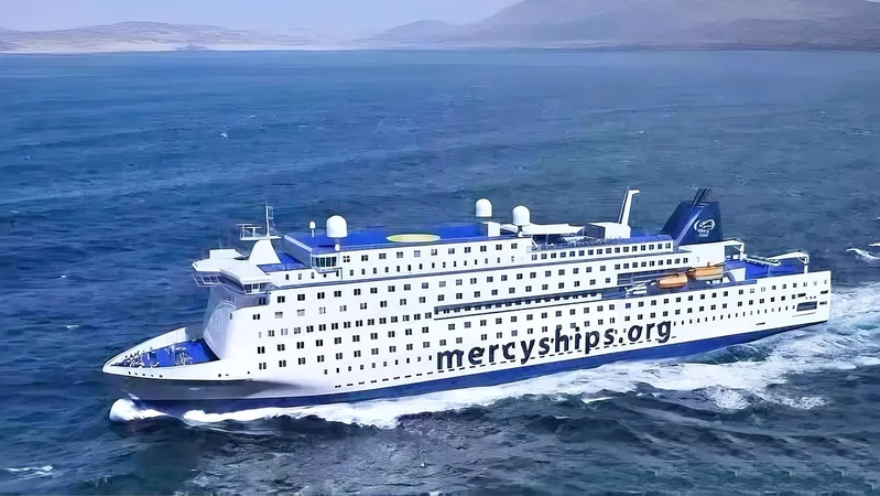 【船型简介】全球最大医院船Mercy Ships,远洋航行医院船,在非洲地区从事慈善医疗和医疗培训活动,集乘客生活、医院医疗、培训教育功能于一体,是一艘具有高品质医院区的中型客船。总长174.1米、型宽28.6米、设计吃水6.15米,服务航速12节,排水量达到3.7万吨,采用两套全回转电力推进器,入级英国劳氏船级社。出航时定员500人,在港停靠期间额定载客可达到950人。全船共有12层甲板,7层公共区域及居住舱室,2层医疗区域。其中3、4甲板医院区域是该船的关键功能区,设有门诊、化验室、CT室、X射线室、手术室、住院部、ICU病房等。在5-11甲板设有大型剧院、超市、船上银行、餐厅、商店、学校等居住区和娱乐休闲区。