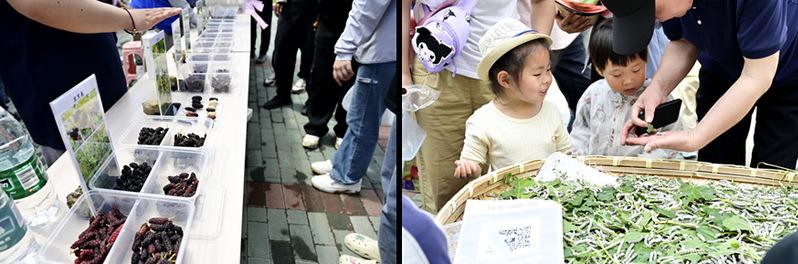 在优异资源展示区,长果桑、中椹1号、中椹3号、镇1224、德江15号等形态多样、风味不同的20余个特色桑品种和不同体色与斑纹的蚕品种引发了各界人士的好奇和热议。大家一边热烈讨论这些与平常认知存在巨大差异的品种,一边品鉴桑果,将颜色丰富的桑果称为大自然的调色盘。小朋友们则对不同颜色桑果进行了喜爱度的排名,纷纷拍照记录丰富多彩的优异果桑资源品种。很多企业和个人在品鉴不同桑果后,表达了对订购优异果桑品种桑苗的兴趣。